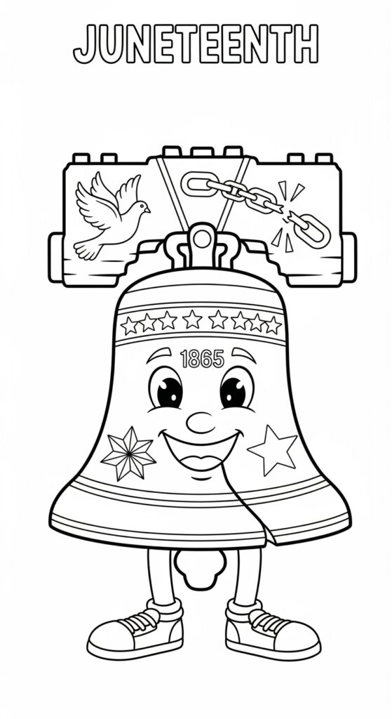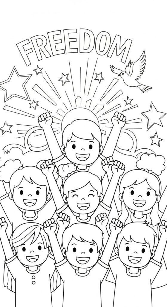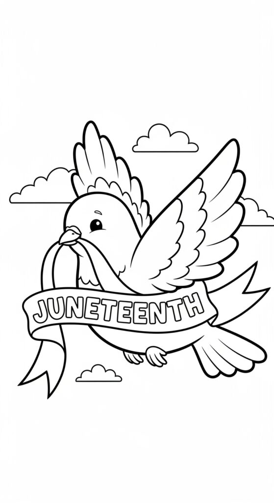This Juneteenth coloring collection honors the journey from enslavement to liberation through meaningful symbols like the Juneteenth Freedom Flag, broken chains, peace doves, unity fists, and quotes such as “Free Since 1865.” Each page invites reflection, pride, and celebration.