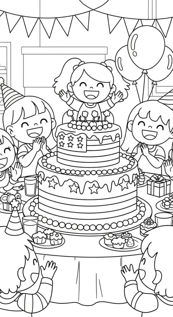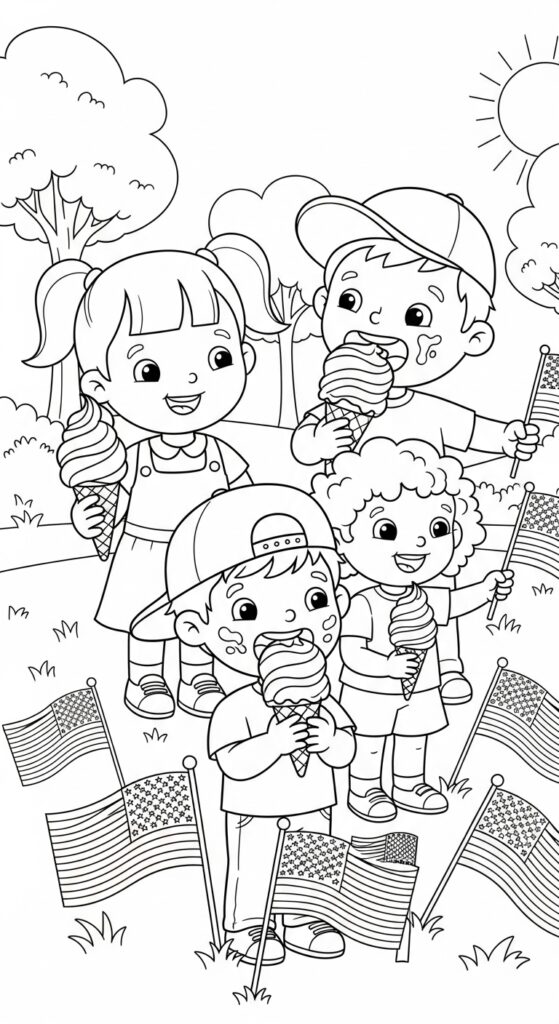 These Flag Day coloring pages are created for kids of all ages. Young children ages 3–5 will enjoy easy designs like waving American flags and red, white, and blue treats with bold, simple shapes. Kids ages 6–8 can color fun scenes such as backyard celebrations, school flag ceremonies, picnics, and parades. Older children ages 9–10 will enjoy more detailed pages featuring flag crafts, patriotic decorations, and marching bands, offering a creative challenge.