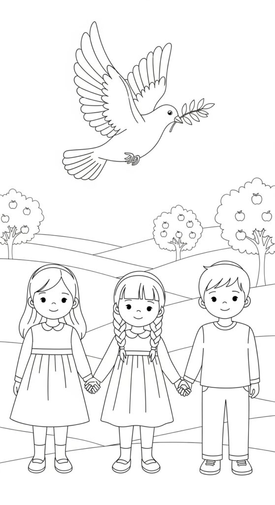 Discover the beauty of Jewish New Year customs with our free printable Rosh Hashanah coloring pages. From happy family gatherings sharing challah dipped in honey to smiling children sounding the shofar, each design reflects the spirit of sweetness, unity, and new beginnings. Delightful touches such as busy bees, ripe pomegranates filled with seeds, and gentle doves carrying olive branches add both charm and symbolism, making every coloring session thoughtful and enjoyable.